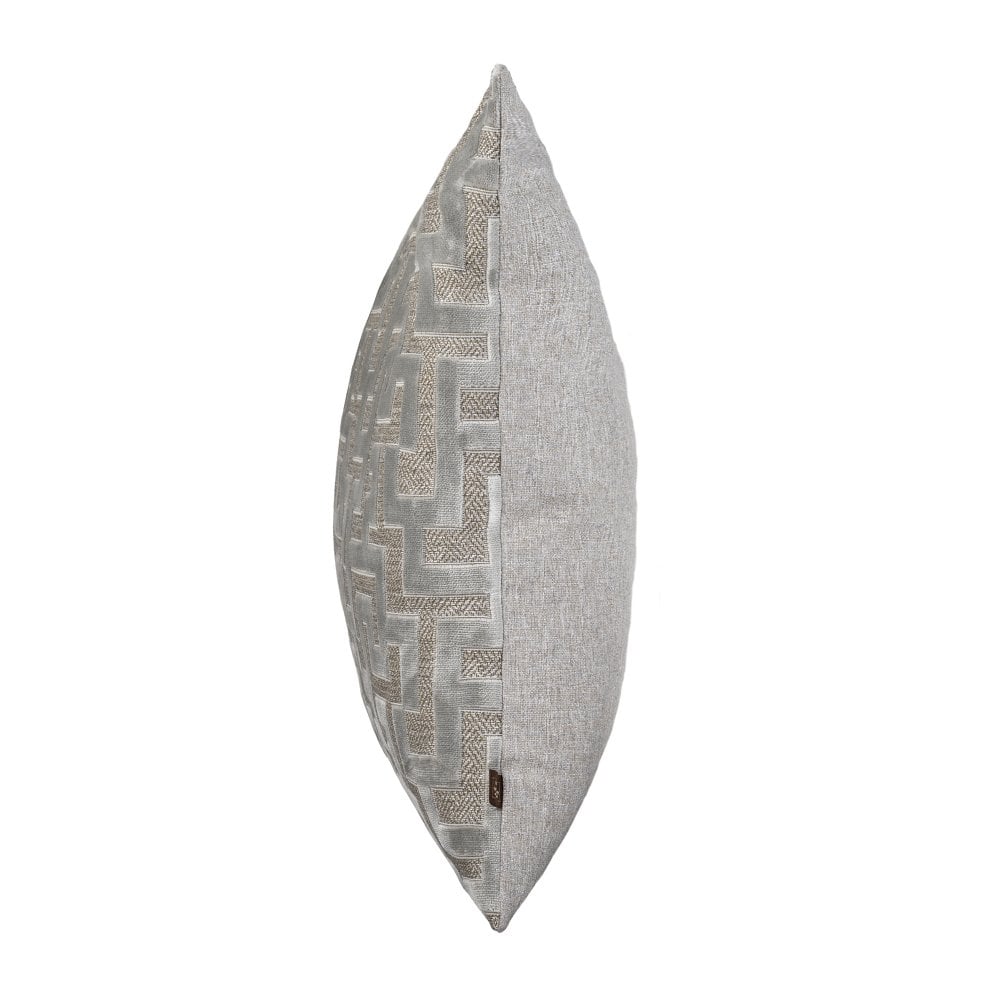 Featuring a lavish cut velvet in a contemporary Greek Key design with a plain linen reverse. Add a modern style to your living room with the Maze Silver, feather-filled cushion from Scatter Box.