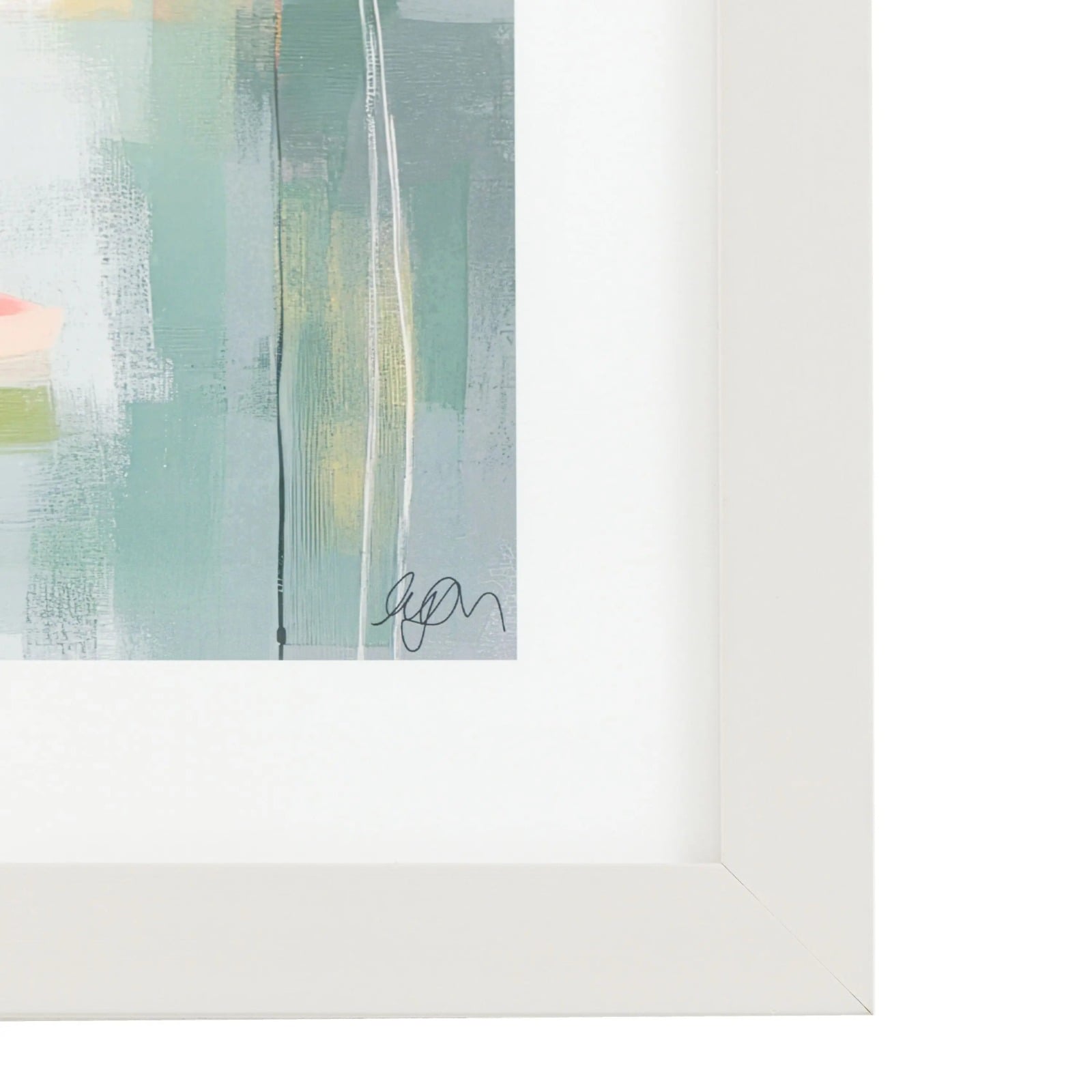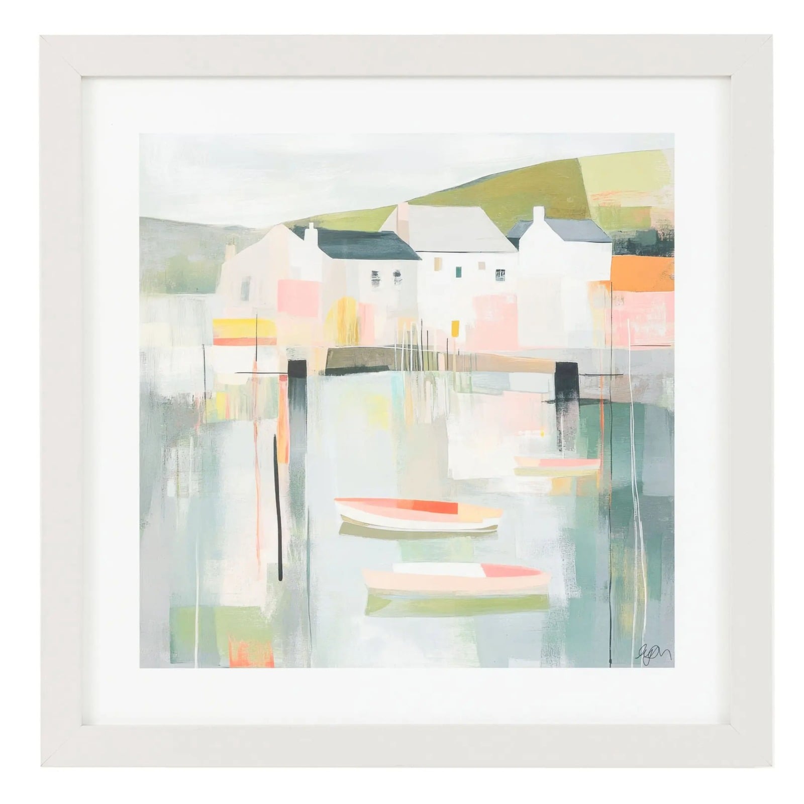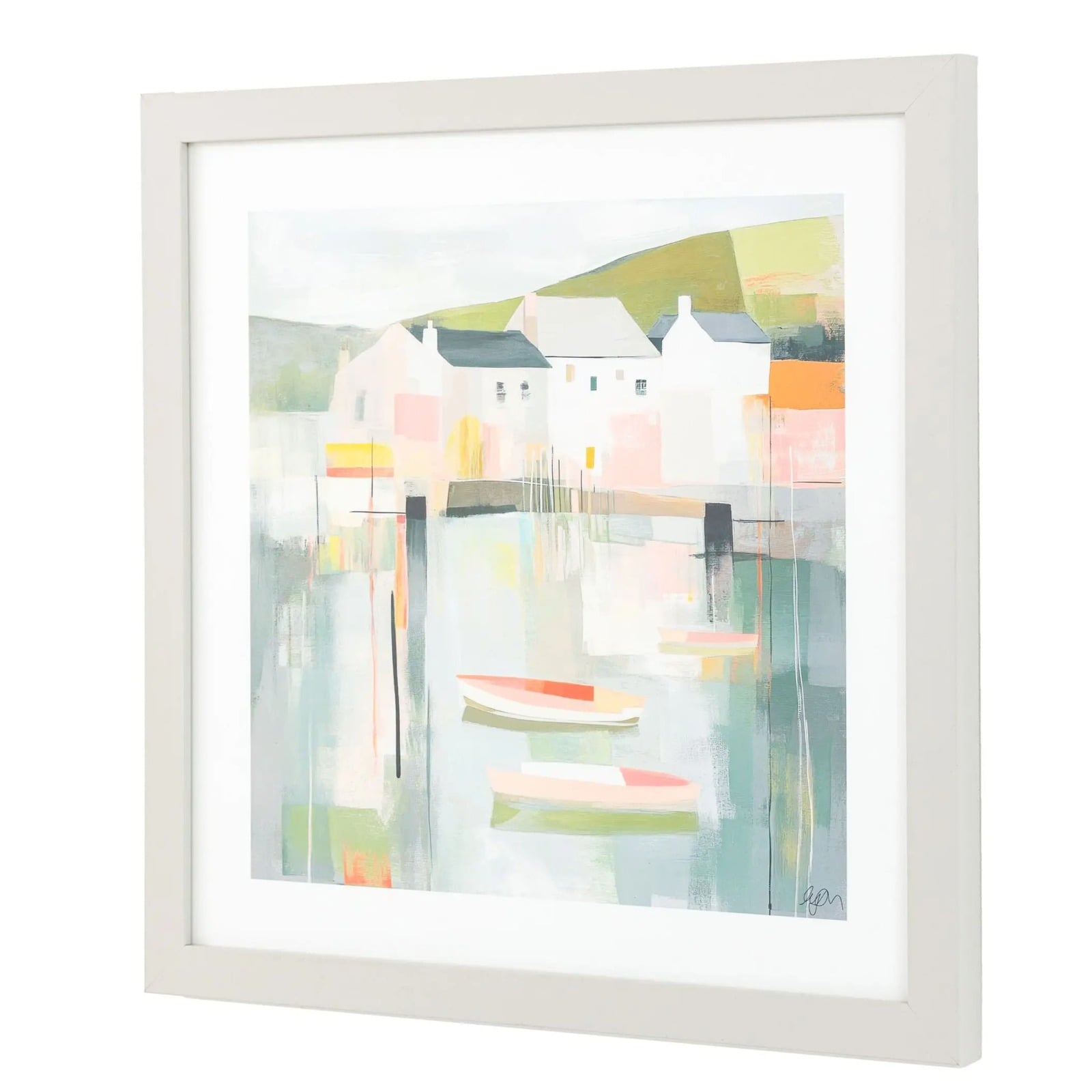 With a peaceful, calm feeling, this modern, slightly abstract painting is a beautiful addition to any wall. A group of harbourside cottages are picked out of soft greys & whites, highlighted with pale pink brushstrokes. Several small sailboats in warm orange & cream tones float tranquilly on the muted grey & blue water, adding to the feeling of calm throughout the painting. This high quality print is finished off in a light grey box frame.