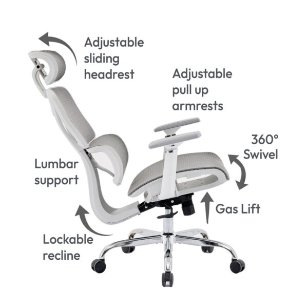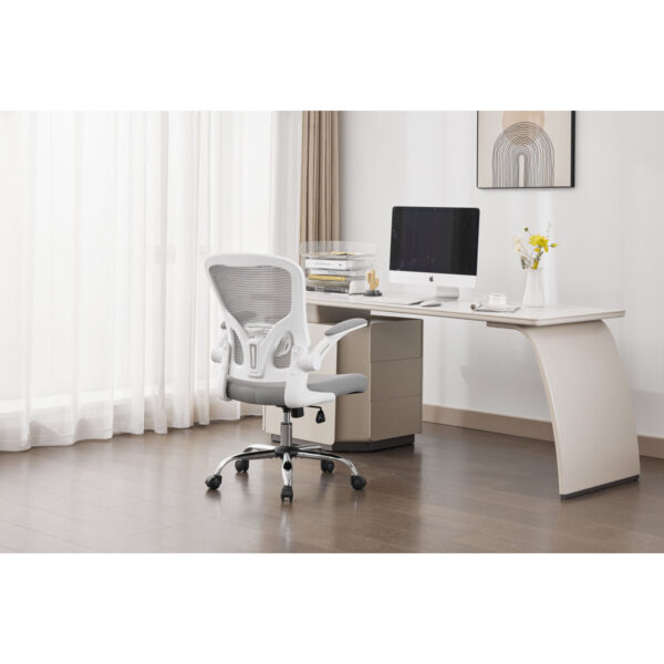 Say hello to your new work buddy with this Panini Grey and White Office Chair. Upholstered in breathable grey mesh fabric, it ensures comfort during long hours of use by promoting airflow and reducing heat build-up. The chair features an ergonomic design with adjustable height and tilting back. The white contoured backrest offers adjustable lumbar support. The sturdy swivel base is fitted with smooth-rolling casters for easy movement, while the durable frame ensures long-lasting use.