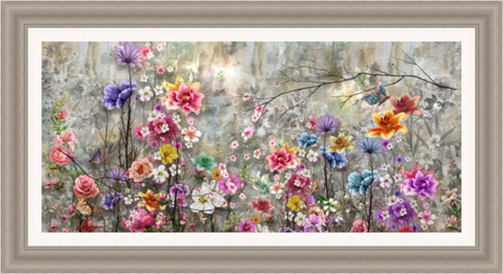 This gorgeous multicoloured flowers picture has beautiful details, making a striking feature in any room of your home. Finished in a beautiful, chunky, champagne frame.
