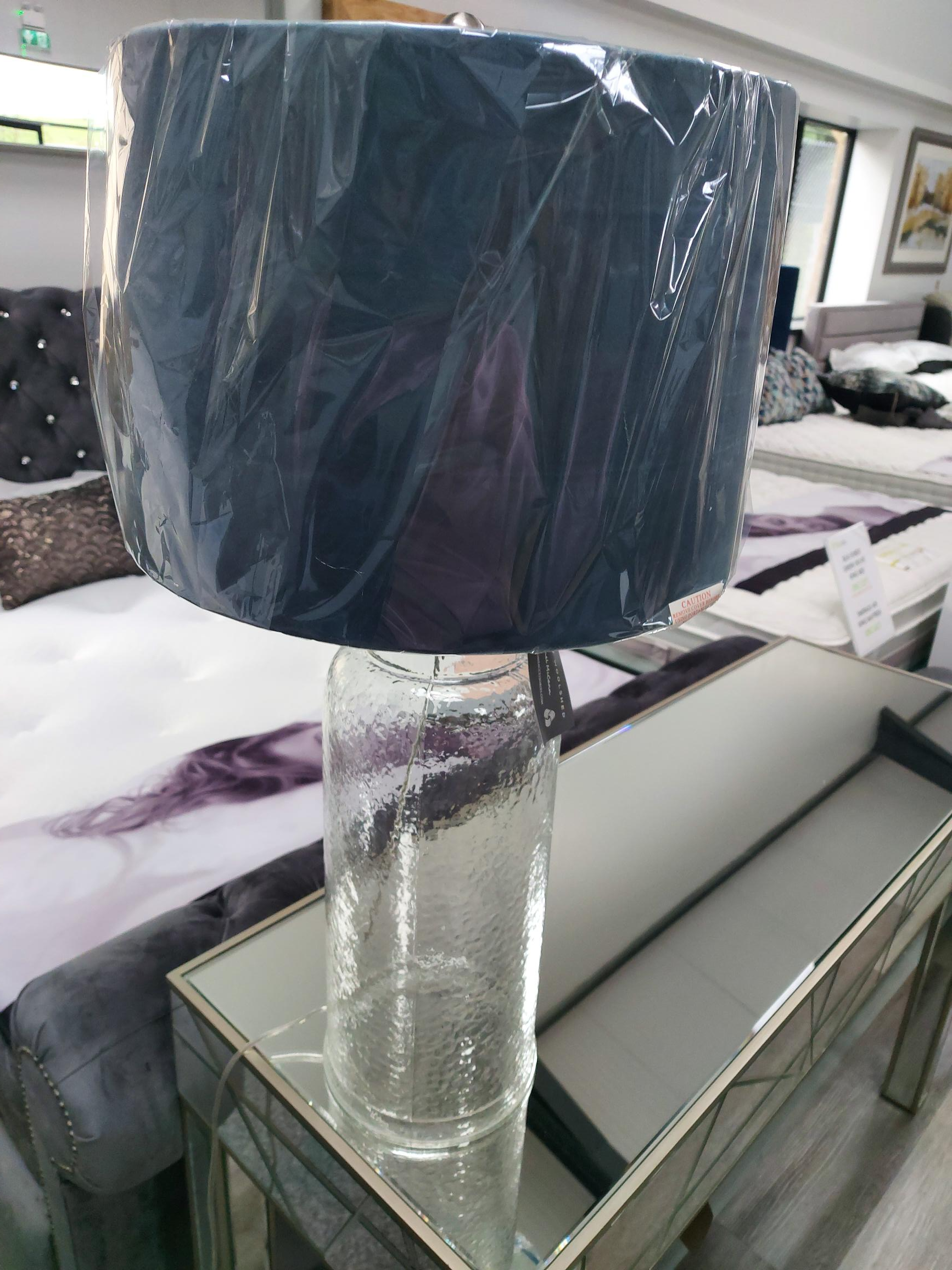 Gorgeous, stylish table lamp with glass detail to the base and a luxurious soft Navy Velvet shade. This lamp is most certainly a statement piece that will complement any room layout.